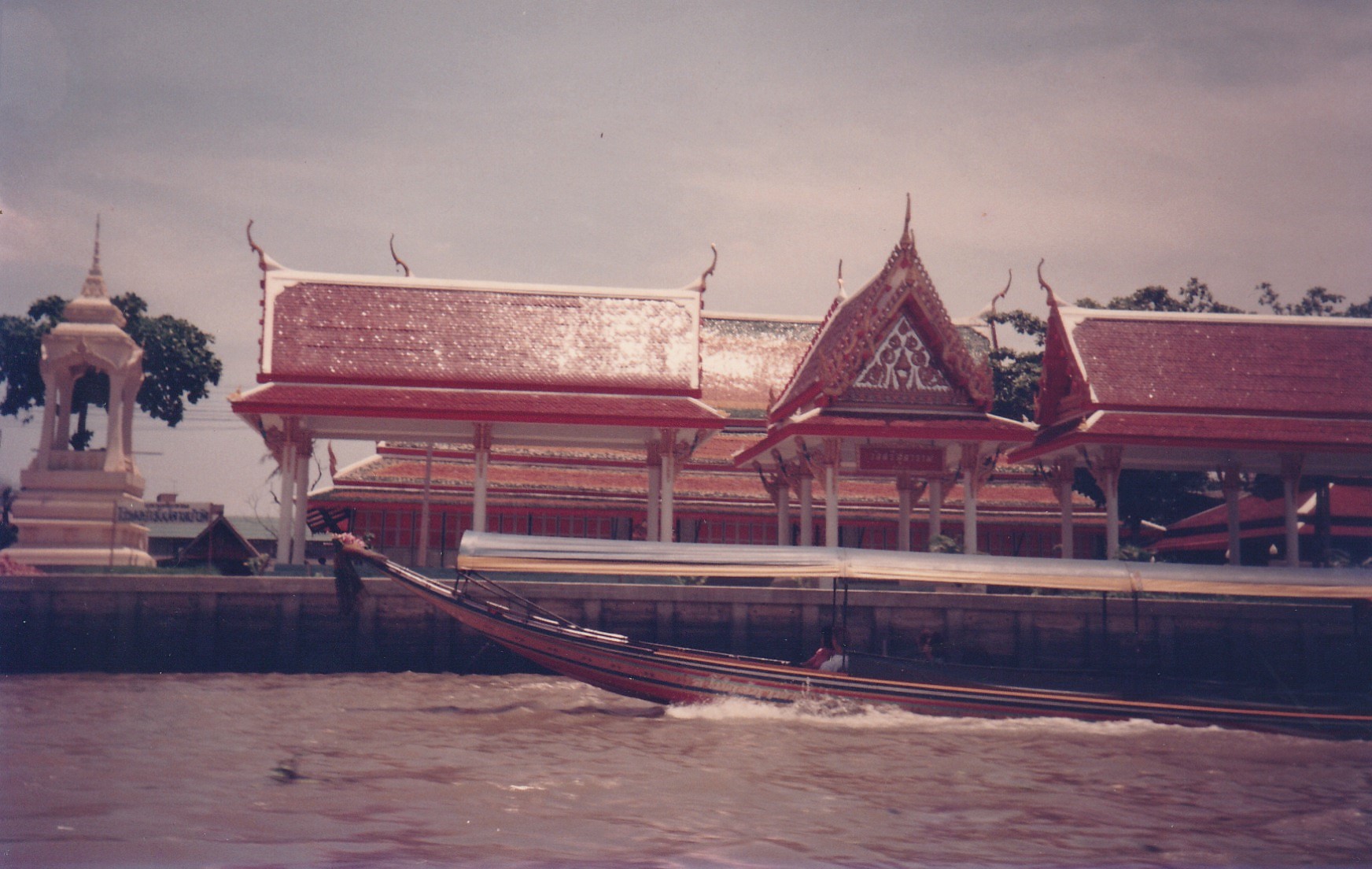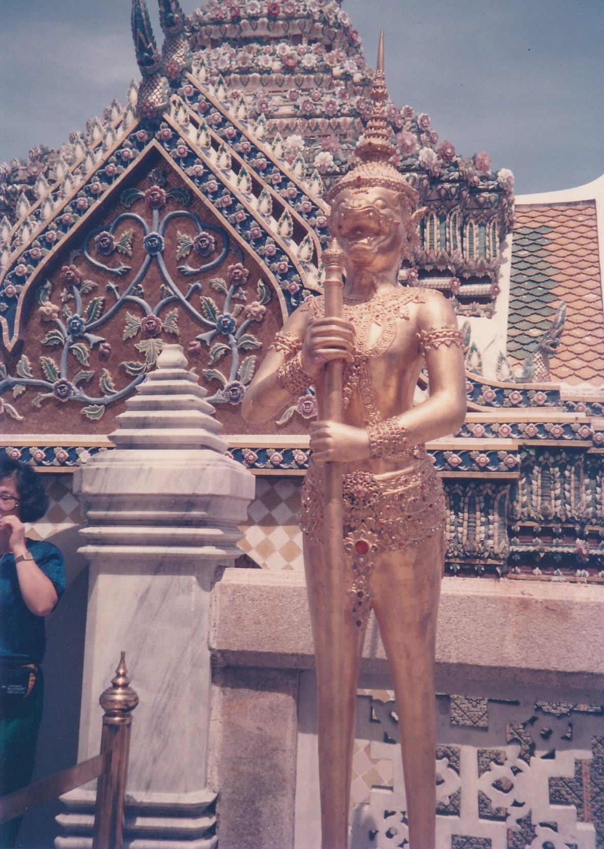 Next day, I headed down to the riverside. The Grand Palace was my destination and I could see it glistening in the distance on the opposite bank of the Chao Phraya River. What a wonderful and fascinating place! Thankfully, I made a photographic record of the amazing Buddhist architecture and wild statues seeming to represent a mixture of animals and humans. I took a photo of what seemed a door covered in art work in gold, then asked a nearby tourist to take one of me in front of the palace. The huge palace complex included the Temple of the Emerald Buddha with it’s towers and spires. After an enjoyable time spent wandering around the Grand Palace it was time for my long-tail boat ride! If you haven’t seen The Man with the Golden Gun, a long-tail boat is a long canoe with a car engine on the back driving a long propeller used for both propulsion and guidance. I found one to hire (with boatman) near the palace and off I went! During the ride, I took two photos – one of what seemed similar to the temple where Bond had to fight local martial artists, and the second which seemed similar to the place where the souvenir elephant salesman was thrown overboard in the film clip linked here.